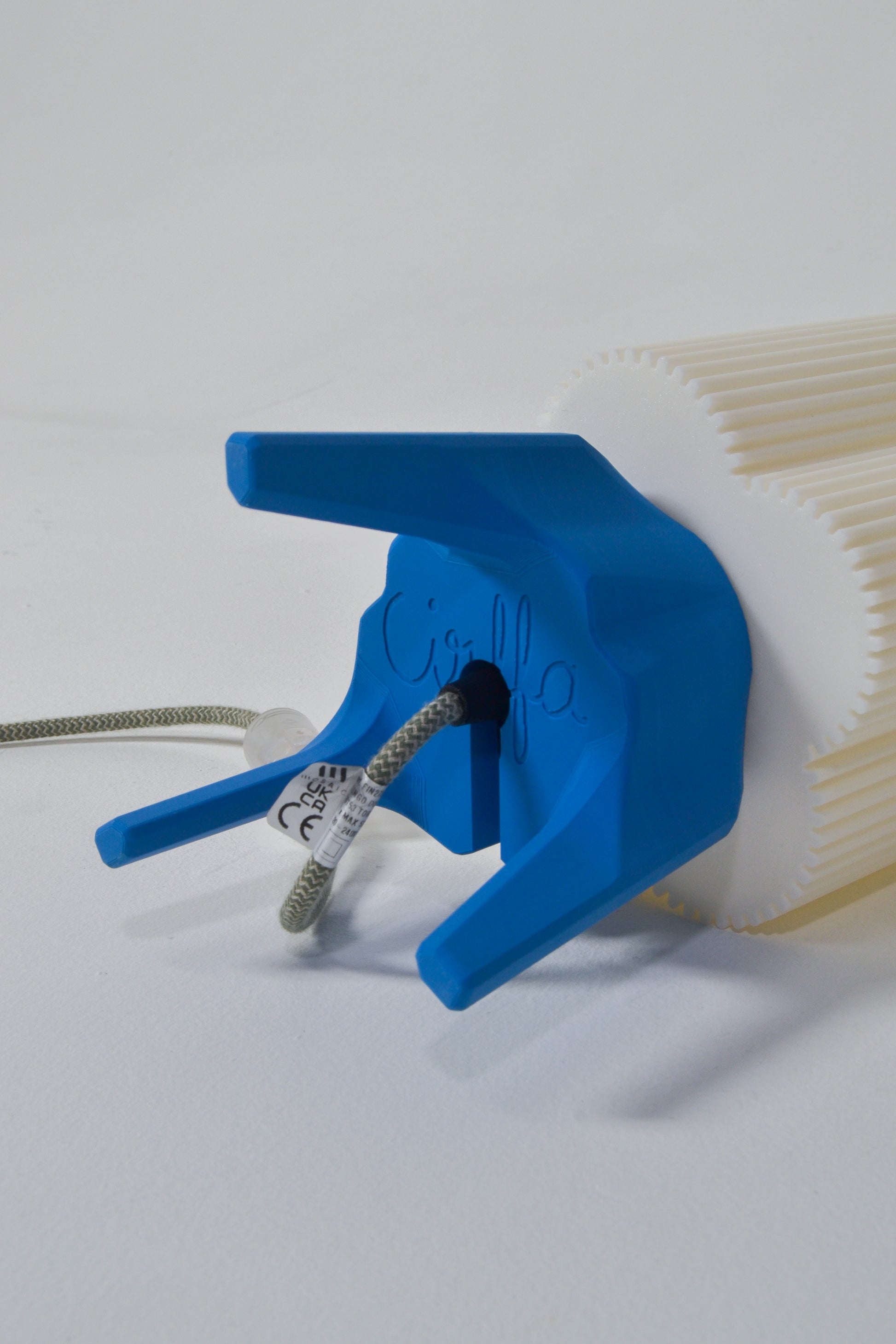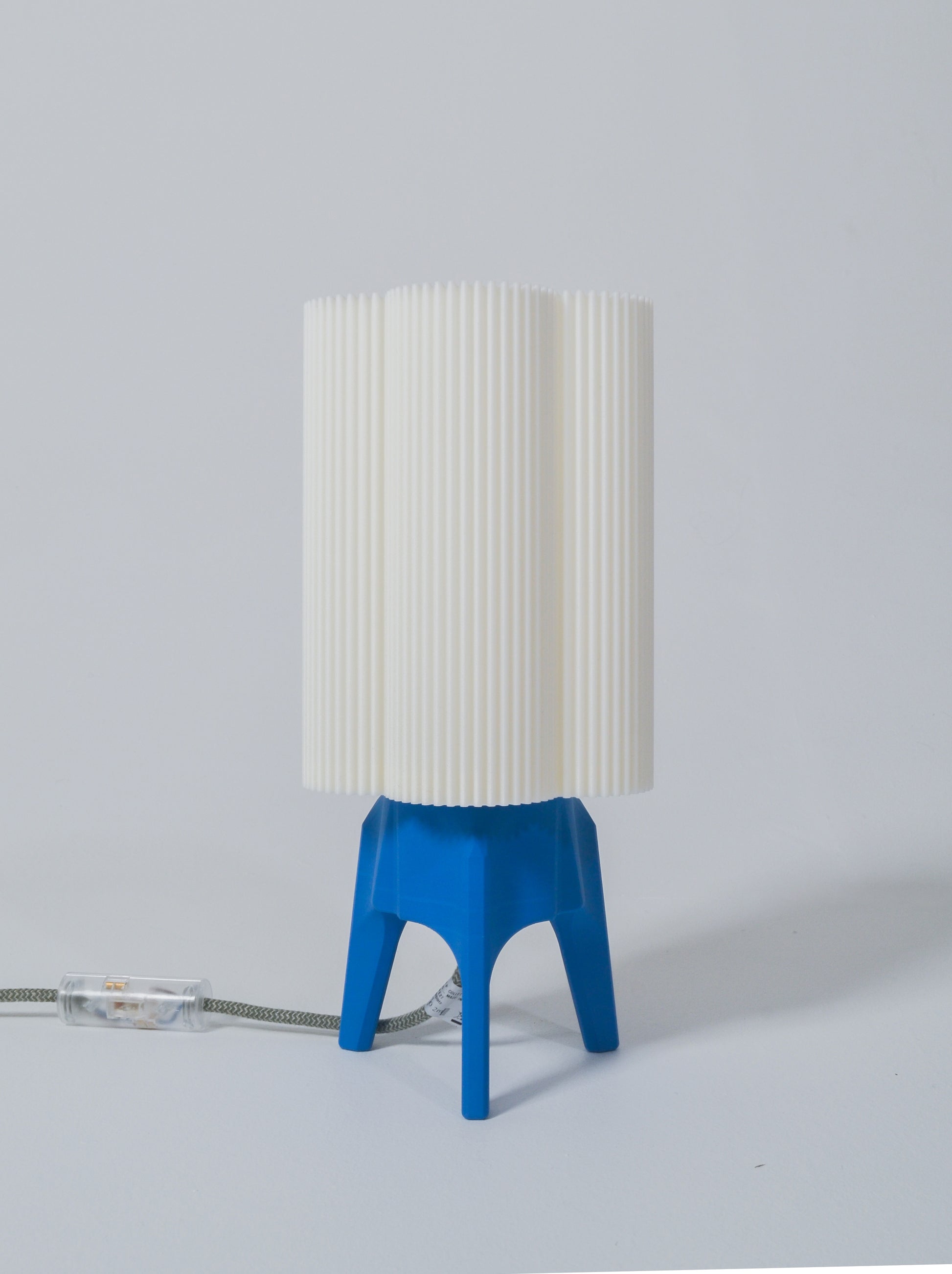 The light is supported by a sturdy, fully 3D-printed tripod base and fitted with a bespoke light fitting and bulb, crafted in Italy by Mosaicluce.
